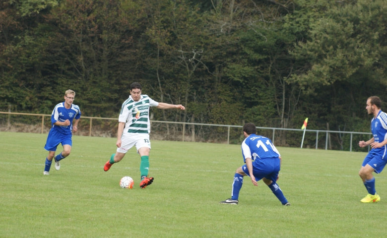 A juste raison puisque c'est notre adversaire qui fait l'essentiel du jeu, utilisant parfaitement les espaces laissés par un bloc Vert aux abois. Haute Bresse ouvre naturellement le score à la 15e minute, après s'être créée plusieurs situations dangereuses, notamment sur un coup de tête sur la barre, le ballon fleurtant avec la ligne du but. Mais les Verts ne baissent pas les bras et c'est Taquin qui redonne espoir à notre équipe en égalisant suite à une passe lumineuse de Quentin en profondeur. L'incontournable Taquin récidive avant la pause grâce à une superbe frappe sous la barre après s'être à nouveau extirpé de la défense adverse.